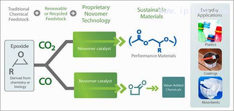 Novomer開發(fā)了以CO2為主要原料生產(chǎn)聚丙烯碳酸酯(PPC)和聚碳酸乙烯酯(PEC)的技術(shù)。基于CO2與環(huán)氧丙烷(PO)或其他環(huán)氧化合物的共聚合,聚合物可以同時(shí)作為熱塑性聚合物和用于包裝和涂覆產(chǎn)品的多元醇來生產(chǎn)。