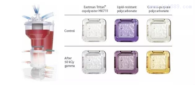 血液治療設備(左)和Tritan共聚酯與聚碳酸酯γ滅菌比較(右)