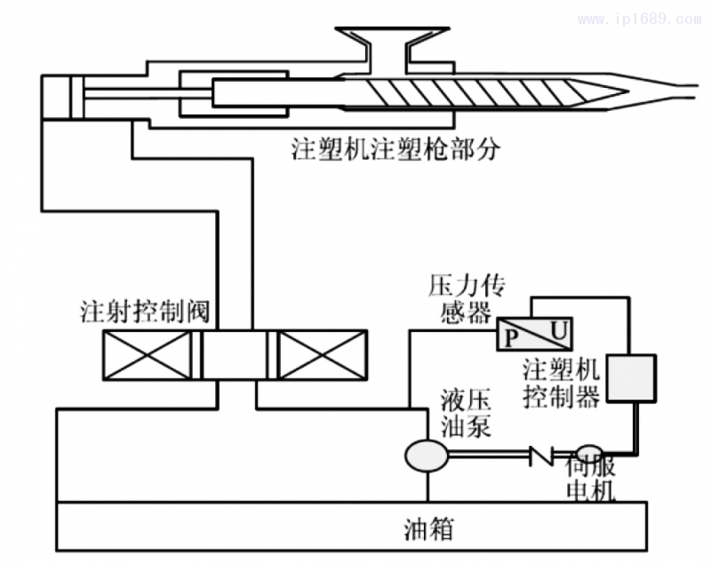 液壓系統(tǒng)是注塑機(jī)的重要組成部分,液壓控制系統(tǒng)直接關(guān)系到塑料制品的質(zhì)量和性能[1-3]。圖1為注塑機(jī)伺服閉環(huán)控制系統(tǒng),該系統(tǒng)包含伺服電機(jī)、液壓泵、液壓閥等器件,與注塑產(chǎn)品生產(chǎn)緊密關(guān)聯(lián)。為保證注塑機(jī)穩(wěn)定工作,注塑機(jī)液壓伺服系統(tǒng)主要采用PID閉環(huán)控制技術(shù)進(jìn)行反饋調(diào)節(jié)。文獻(xiàn)[4]將PID與神經(jīng)網(wǎng)絡(luò)融合,實(shí)時(shí)調(diào)節(jié)液壓控制系統(tǒng)相關(guān)參數(shù),顯著提高了注塑制品的尺寸精度;文獻(xiàn)[5]使用PID分段控制液壓系統(tǒng),提高了注塑機(jī)控制精度,克服了PID固定參數(shù)引起控制精度下降的問題;文獻(xiàn)[6]結(jié)合變論域與自適應(yīng)模糊PID控制理論設(shè)計(jì)了控制系統(tǒng),顯著提高了注塑機(jī)液壓系統(tǒng)的動(dòng)態(tài)性能。上述方案均具有自動(dòng)調(diào)節(jié)能力,大幅提升了注塑制品的質(zhì)量和生產(chǎn)效率,但是在參數(shù)選擇上仍然不夠快速靈活,存在調(diào)節(jié)時(shí)間過長等問題。