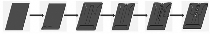在手機支架的建模過程中使用了拉伸、倒角、鏡像、陣列等常用的建模方法,主要的過程如圖2所示。從零件圖可看出,該支架外形扁平,其結構較為復雜,長85mm,寬54mm,總體厚1.3mm,最薄處0.2mm。