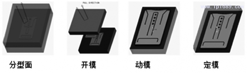 完成產品建模后利用CREO軟件進行分模設計。分模時使用了CREO制造模塊下的模具型腔子模塊,流程如圖3所示所示。考慮到該塑件形狀復雜,模具整體外形尺寸的大小關系,模具零件加工的難易程度,現決定選用一模一腔的模具結構形式。分型面選在模型的上表面,這樣最主要的成型區域都留在動模板上,方便加工,如圖4所示。
