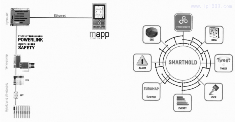 SmartMold 9采用的是將IO與PLC控制器集成于一體,如圖6所示,其橙色的盒子 部分即為控制、IO一體,然后通過以太網(wǎng) 連接HMI,HMI畫面設(shè)計(jì)可以基于mappVIEW 來實(shí)現(xiàn),而控制器本身提供了滿足絕多數(shù)注塑機(jī)所需的I/O配置。
