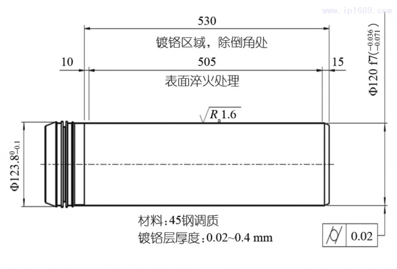 圖 1 是該活塞桿的尺寸簡圖,從簡圖上可以看出, 該活塞桿材料要求為 45# 鋼調(diào)質(zhì),Ф120 f7(-0.036/- 0.071)段需鍍鉻處理,其表面粗糙度為 Ra1.6,長度為 530 mm,鍍鉻厚度要求 0.02~0.04 mm。同時,鍍鉻 段有較高的尺寸要求(f7)和形狀公差要求(圓柱度 0.02),表面還需淬火處理。