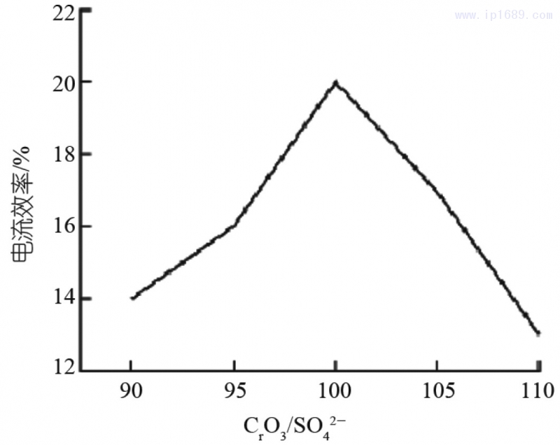 影響很大。當(dāng)硫酸含量過低時,得不到鍍層或得到的 鍍層很少,主要是棕色氧化物。若硫酸過量時,會造 成覆蓋能力差、電流效率下降,并可能導(dǎo)致局部或全 部沒有鍍層。在確定了鉻酐的質(zhì)量濃度的基礎(chǔ)上,探 索合理的鉻酐與硫酸的質(zhì)量濃度比。圖 4 為鉻酐與硫 酸的質(zhì)量濃度比對電流效率的影響。從圖中可知,當(dāng) CrO3/SO42- 為 100:1 時,電流效率最高,且鍍層外觀 質(zhì)量和性能均較好 ;當(dāng) CrO3/SO42- 小于或等于 50:1 時,由于催化劑含量偏高,使陰極膠體膜的溶解速度 大于生成速度,陰極電位也達不到鉻的析出電位,導(dǎo) 致局部、乃至全部沒有鉻的沉積,鍍液的電流效率降 低,分散能力明顯惡化 ;當(dāng) CrO3/SO42- 大于 100:1 時, SO42- 含量不足,鍍層的光亮性和鍍液的電流效率降 低,得到的鍍層不均勻,有時發(fā)花,特別是凹處還可 能露出基體金屬。