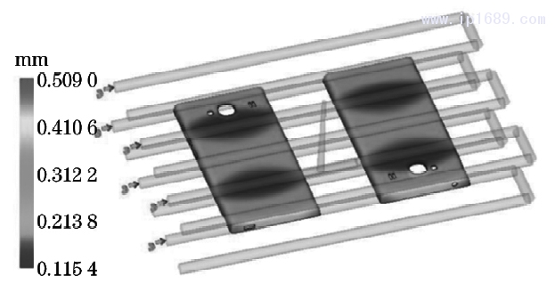 最佳工藝參數(shù)組合 A3B1C2D1未出現(xiàn)在正交表中,為驗(yàn)證其可靠性,在 MoldFlow 軟件中再次運(yùn)行該注塑模擬。由圖3可以看出,最佳工藝參數(shù)下翹曲變形主要出現(xiàn)在手機(jī)后蓋四角處,且耳機(jī)插孔旁的翹曲變形量最大,為0.5090 MM,小 于 表2中 的所有數(shù)據(jù)。同時(shí),對(duì)制件結(jié)構(gòu)進(jìn)行分析后,發(fā)現(xiàn)此處也是塑料熔體流動(dòng)最為復(fù)雜的區(qū)域,且位于注塑模具的拐角部位,散熱條件較差,極易發(fā)生翹曲變形。