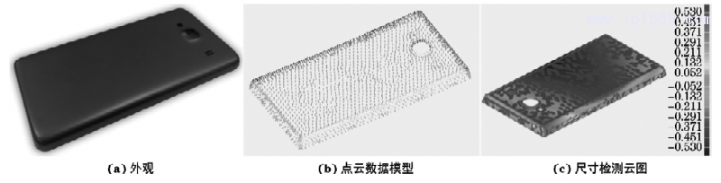 采用上述優(yōu)化的工藝參數(shù)對(duì)薄壁制件進(jìn)行生產(chǎn)試制,得到的手機(jī)后蓋的外觀如圖4(a)所示。采用daisyPH10T 型柔性三維激光掃描儀對(duì)試制產(chǎn)品進(jìn)行點(diǎn)云掃描,獲 得 點(diǎn) 云 數(shù) 據(jù) 模 型,如 圖 4(B)所 示。將點(diǎn)云數(shù)據(jù)模型及原始三維模型導(dǎo)入 GEoMagiC軟件中,以點(diǎn)云數(shù)據(jù)為測(cè)試模型,原始三維模型為參考模型,在 GEoMagiCQualiFy中將測(cè)試模型與參考模型進(jìn)行比較,得 到 如 圖4(C)所 示 的 尺 寸 檢 測(cè) 云 圖。由圖4(C)可以看出,翹曲變形主要出現(xiàn)在手機(jī)后蓋四角處,耳機(jī)插孔旁的翹曲變形量最大,為0.530MM,與有限元模擬結(jié)果基本吻合。