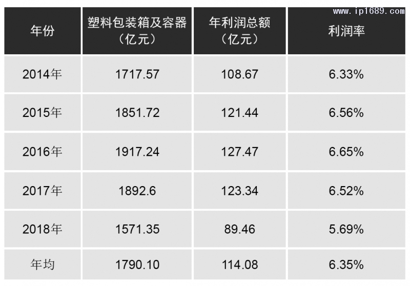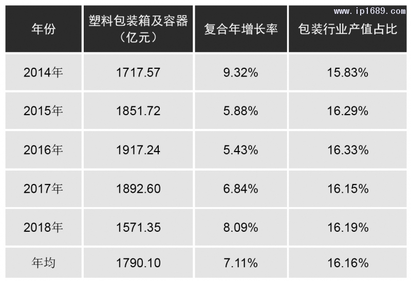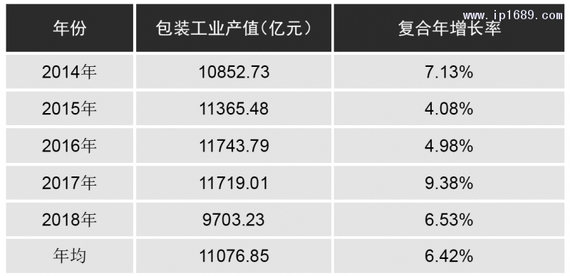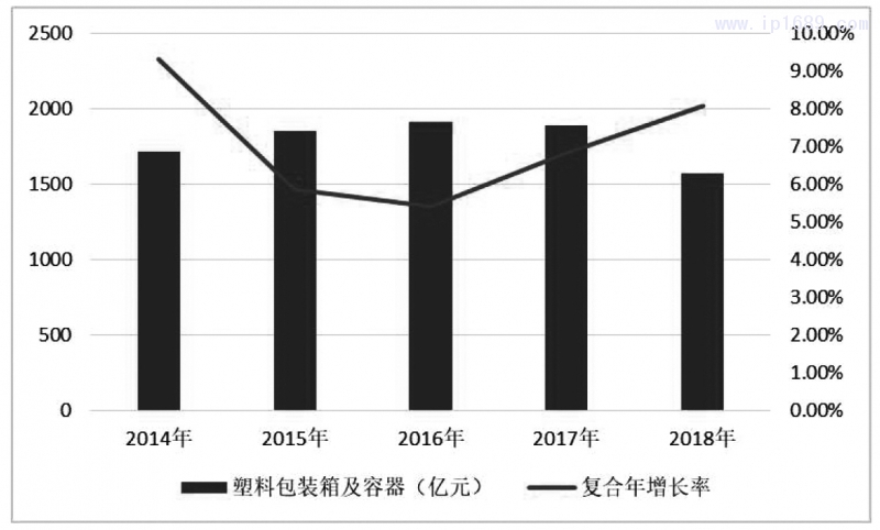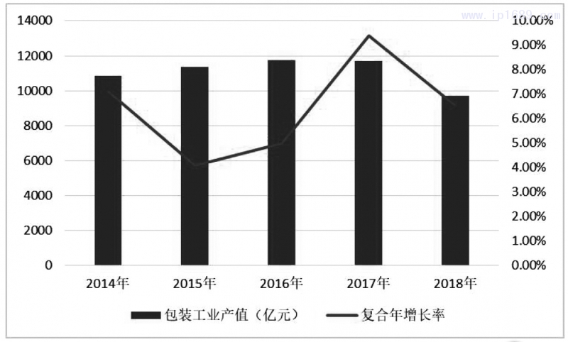 在了解塑料包裝行業情況前,先了解一下我國目前包裝工業產值的相關數據。根據中國包裝聯合會在其官方網站上發布《中國包裝行業年度運行報告》[2],匯總其2014年至2018年的五年統計數據如下表1及圖1所示。