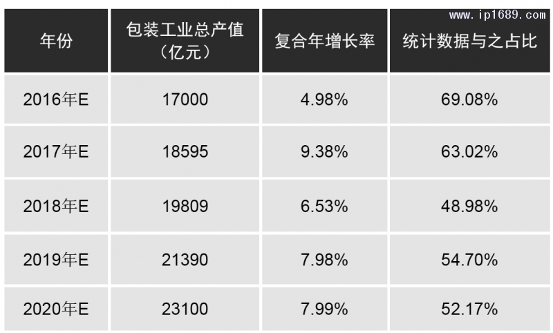 從數據上來看,上述圖表基于我國工業部的統計數據,是對包裝行業的規模企業產值(年主營業務收入2000萬及以上)的統計,不是完全的行業總產值統計數據。而被統計的規模企業從2014年至2018年也僅從7325家增至7830家,但從企查查官方網站中,僅以“包裝有限公司”一個主要搜索字段查到的企業就達25萬余家,可見包裝行業從業企業數量之多,行業集中度之低[3],可見包裝工業實際總產值與規模統計產值之間差異之大。根據2016年12月,工信部聯合商務部發布《關于加快我國包裝產業轉型發展的指導意見》,提出到2020年,實現以下目標,“包裝產業年主營業務收入達到 2.5萬億元,形成15家以上年產值超過50億元的企業或集團,上市公司和高新技術企業大幅增加。”十三五期間,包裝產業產值復合年增長率預計超過8%[4]。因此根據上述數據,以及復合年增長率可估算2016年至2020年的包裝工業總產值數據如表2所示。