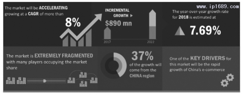 根據Revolution的統計數據,全球可循環包裝市場規模將從2018年的379億美元增長到2023年的512億美元,復合年增長率為6.2%。2019年全球總規模預估為401億美元,歐洲地區成為全球最大的可循環包裝市場;亞太地區成為成長增長最快的可循環包裝市場,約占全球市場總規模的四分之一;其中汽車零部件行業對可循環包裝市場中對產品安全和差異化的要求也推動了整個市場規模的增加[5]。同時根據Technavio的最新市場研究報告,2017年中國的循環包裝市場份額已經達到了亞太地區份額的36%;并預計亞太地區從2018年至2022年期間,循環包裝市場規模的復合增長率將超過8%,其中至少37%的增長將來源于中國,且中國電子商務的迅猛發展將助推循環包裝市場規模的高速增長[6] [7],如圖4所示。
