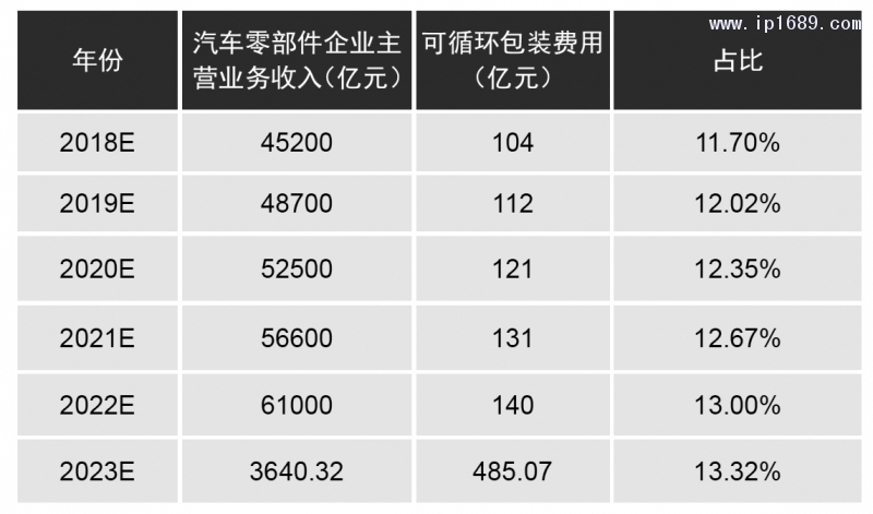 但實際上汽車零部件行業面臨較大的成本壓力,加上可循環包裝模式在該行業的成熟應用,已經開始擴展到了洲際間的零部件貿易流轉,這也加大了汽車零部件在洲際間循環應用場景,因此預測采用循環包裝模式的零部件規模將超過三分之一;同時伴隨循環包裝使用場景的增加,這也會使循環包裝的實際使用費用降低;但總體上循環包裝在汽車零部件行業還是會顯現一個良好的增長勢頭及市場占有率。