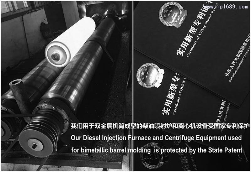 作為三十多年前雙金屬機筒螺桿的研發單位,上海原元康公司深知襯套工作面合金保護層使用壽命的質量關鍵所在,當然是保護層材料成份及其成型工藝。因此除了從源頭上嚴格控制保護層合金材料的配方以外,還專門申請了國家專利以嚴格掌控合金保護層的爐前成型工藝。源頭成份的達標保障了合金材料里面有足夠的和合適的元素配方,可以保障起到抗磨損關鍵作用的硬質相碳化物顆粒在合金層內高比例的分布(理論上更詳細的了解,請參閱文件【保持合金層硬質相占比是雙金屬機筒達標首要條件】)。原元康公司獨到的受專利保護的成型設備則能夠保障雙金屬襯套在成型過程中,這些硬質相碳化物可以在合適而苛刻的溫度下快速成型,既不會由于溫度低而影響硬質相顆粒的均勻彌散,從而導致材料金相組織內部的應力集中,減弱合金層與母材的結合強度;同時也不會由于溫度高而導致硬質相碳化鎢顆粒被燒損。這些苛刻的成型溫度條件,恰恰對于雙金屬機筒或者雙金屬襯套來說是至關重要的。