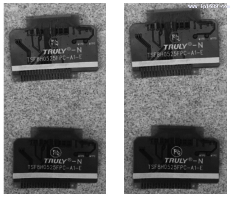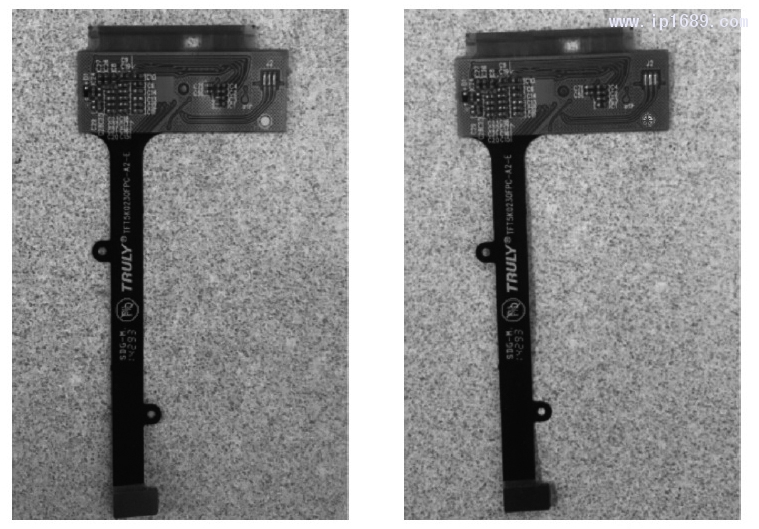 在實際生產中,也會遇到一些異形 FPC,拖著長長尾巴的 FPC 也是較常見的,如圖 7 所示,為了抓取牢靠,在 FPC 上料機上增加輔助吸嘴的機械結構來保證抓取穩固。該程序可以根據實際需要,返回機 械手最佳單一坐標,或者同時返回靶標圓心位置和輔助靶標圓心位置,如圖 8。