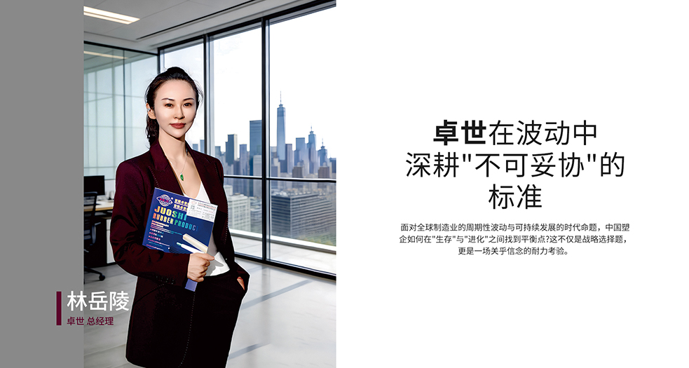 東莞卓世總經理-林岳陵 林岳陵一如既往地優雅從容。她戴著一副大黑框眼鏡,一身綠色中式外套、著一雙高筒靴,身子舒展地靠在椅背上,不時輕輕捋一捋發梢