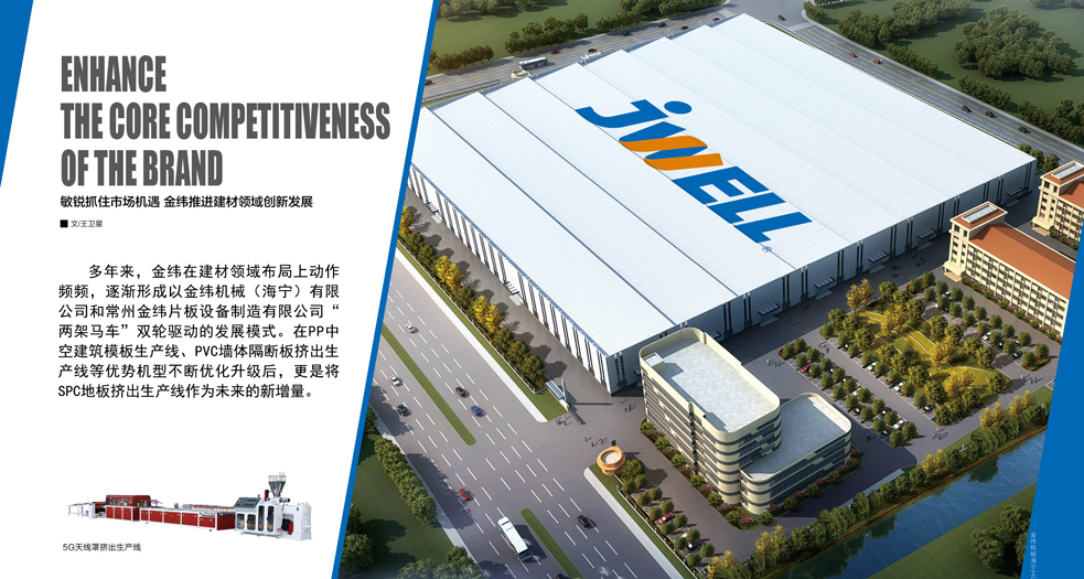 多年來,金緯在建材領域布局上動作頻頻,逐漸形成以金緯機械(海寧)有限公司和常州金緯片板設備制造有限公司“兩架馬車”雙輪驅動的發展模式。在PP中空建筑模板生產線、PVC墻體隔斷板擠出生產線等優勢機型不斷優化升級后,更是將SPC地板擠出生產線作為未來的新增量。