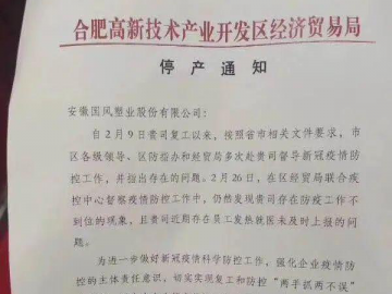 在3月1日,就發生一起復工后疫情事件,國風塑業已被責令停產整頓,待各項防控措施落實后方可復工。