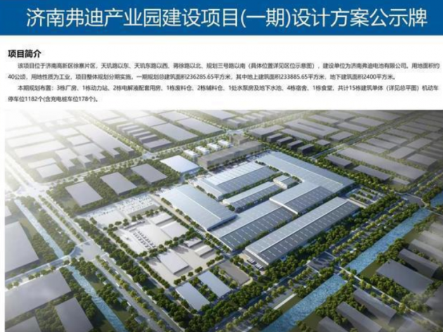 10月12日,濟南市自然資源和規劃局公示了濟南弗迪產業園建設項目(一期)設計方案,建設單位為濟南弗迪電池有限公司。