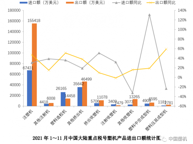 2021年1-11月中國大陸塑料機械12個重點稅號產品進出口總額53.58億美元,同比增長31.78%。其中,進口額19.42億美元,同比增長24.86%;出口額34.16億美元,同比增長36.06%;貿易順差14.74億美元,同比增長54.33%。
