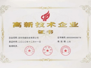 力勁集團深圳領威科技有限公司再次通過“高新技術企業”認定。深圳市科技創新委員會、深圳市財政局、國家稅務總局深圳市稅務局聯合頒發“高新技術企業證書”。