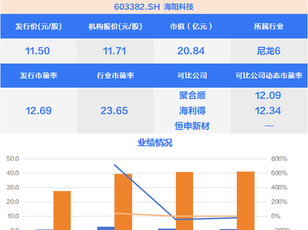6月12日,新股上市,為滬市主板的海陽(yáng)科技(603382.SH),該公司系國(guó)內(nèi)從事尼龍6系列產(chǎn)品研發(fā)、生產(chǎn)和銷售的主要企業(yè)之一,已經(jīng)形成集切片、絲線以及簾子布完整的尼龍6系列產(chǎn)品體系。