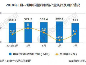7月塑料制品行業運行情況1. 生產情況:2018年1-7月,我國塑料制品行業累計完成產量3560.2萬噸,同比增長2.2%。2. 銷售情況:2018