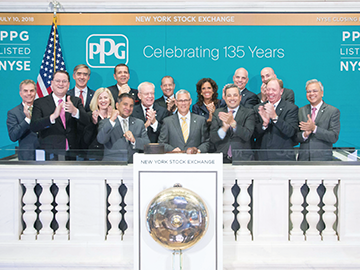 7月13日,PPG(紐約證券交易所代碼:PPG)董事長兼首席執行官Michael H. McGarry領銜的管理團隊在紐約證券交易所敲響閉市鐘,慶祝PPG創立135周年。
