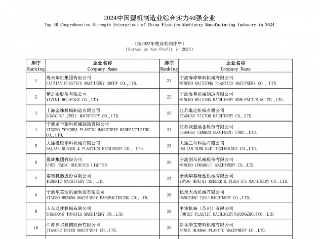 根據各單位上報的2023年度資料,經相關部門審查和核實,確定出“2024中國塑機制造業綜合實力40強企業”、“2024中國塑料注射成型機行業18強企業”、“2024中國塑料擠出成型機行業 14 強企業”、“2024中國塑料中...