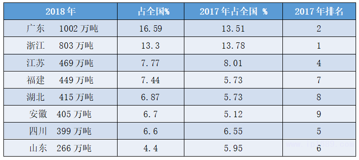 2016-2018:全國塑料制品總產量21274萬噸,年均產量7100萬噸;同期廣東總產量3022萬噸,年均1000萬噸,占全國14.2%,達七分之一。