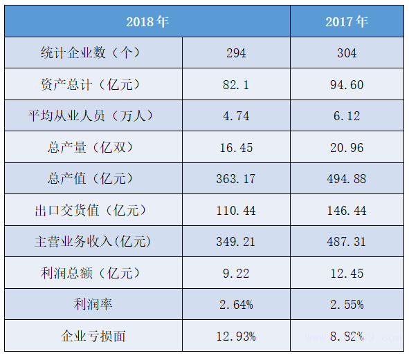 統計數據表明,總產值、資產總計、主營業務收入等數據均有較大下降,利潤率處于低值,用工人數減少。主要產區在揭陽,全年產量14.4億雙,占統計數據86%。