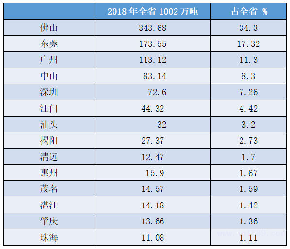 佛山、東莞、廣州等大灣區城市是主產區,佛山的產量占全國約4.75%,可排在省份第7。東莞的產量占全國3.5%,可排在同期省份第11 。