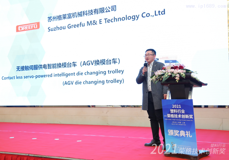 蘇州格萊富機械科技有限公司憑借突破性的產品創新,格萊富AGV無軌換模臺車成功斬獲2021塑料行業—榮格技術創新獎!