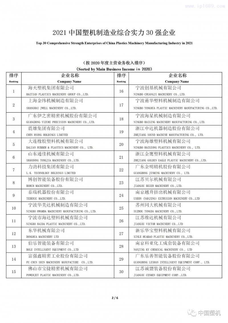 評(píng)選由中國(guó)塑料機(jī)械工業(yè)協(xié)會(huì)組織,分別以“2020年度主營(yíng)業(yè)務(wù)收入”和“2020年度凈利潤(rùn)”為主要經(jīng)濟(jì)指標(biāo)進(jìn)行排序。堅(jiān)持公平、公正及準(zhǔn)確和權(quán)威原則,根據(jù)排序條件、企業(yè)申報(bào)材料、調(diào)查審核情況, 確定出“2021中國(guó)塑機(jī)制造業(yè)綜合實(shí)力30強(qiáng)企業(yè)”、“2021中國(guó)塑料注射成型機(jī)行業(yè)18強(qiáng)企業(yè)”、“2021中國(guó)塑料擠出成型機(jī)行業(yè)12強(qiáng)企業(yè)”、“2021中國(guó)塑料中空成型機(jī)行業(yè)5強(qiáng)企業(yè)”和“2021中國(guó)塑機(jī)輔機(jī)及配套件行業(yè)5強(qiáng)企業(yè)”入選名單。