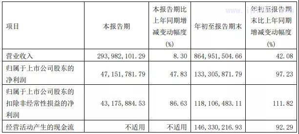 泰瑞機器股份有限公司(簡稱“泰瑞”)于2021年10月22日披露的三季報顯示,2021年前三季度公司實現營業總收入8.6億元,同比增長42.1%;實現歸母凈利潤1.3億,同比增長97.2%;每股收益為0.47元。其中,2021第三季度實現營業收入為2.9億元,歸屬上市股東凈利潤為47151781.79元。