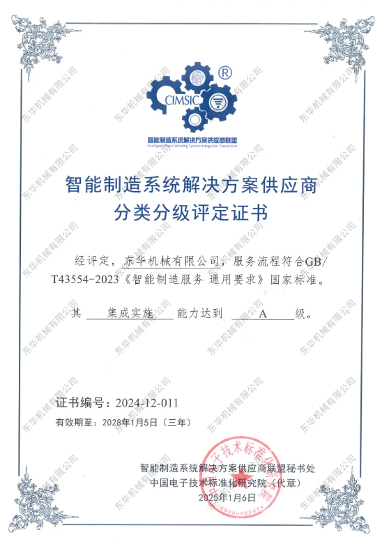 我們東華機械積極申報了“智能制造系統解決方案供應商分類分級評定(第三批)”,經過嚴格的評審,我們很高興地宣布:東華機械服務流程符合GB/T 43554-2023《智能制造服務通用要求》國家標準,集成實施能力達到A級!