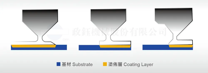 微凹輪透過滾輪上網(wǎng)紋進行涂布,涂布厚度容易受網(wǎng)紋影響,適用于中低黏度(小于3000cp)涂布;逗號輪則是透過與基材間間隙來控制涂布厚度,接觸面容易產(chǎn)生條紋或氣泡,適合中黏度(500-5000cp),實務使用上為了因應更多元涂布制程,建議可使用多功能涂布座,能夠針對生產(chǎn)需求選用狹縫式模具、微凹或是逗號輪。