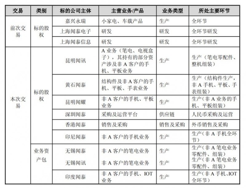 據聞泰科技披露,前次交易標的涵蓋嘉興永瑞(小家電、車載產品)、上海聞泰電子(研發)、上海聞泰信息(研發)共3家子公司的股權。本次交易標的則包括昆明聞訊(A業務及部分非A業務)、黃石聞泰(結構件及非A客戶業務)、昆明聞耀(非A客戶業務)、深圳聞泰(采購及運營平臺)、香港聞泰(銷售及采購)、印尼聞泰(非A客戶的手機業務)的股權,以及無錫聞泰、無錫聞訊、印度聞泰等3家子公司的業務資產包。