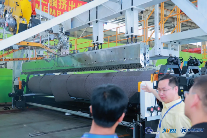 現(xiàn)場,創(chuàng)新材料的應(yīng)用成果更是打開了行業(yè)未來發(fā)展的想象空間。技術(shù)員微笑著指向身旁的HDPE8000寬幅土工膜擠出生產(chǎn)線:“這是兩項(xiàng)生產(chǎn)線產(chǎn)品屬于國內(nèi)首創(chuàng),工藝技術(shù)、設(shè)備性能、產(chǎn)品質(zhì)量等方面均達(dá)到了國際先進(jìn)水平。”