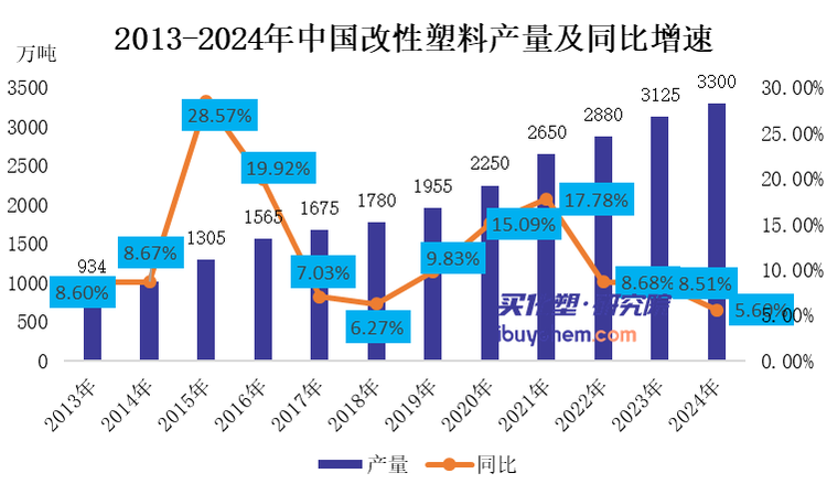 從行業數據來看,中國改性塑料市場規模持續增長。據買化塑研究院監測,2024年中國改性塑料產量達3300萬噸,較2023年增長5.6%。