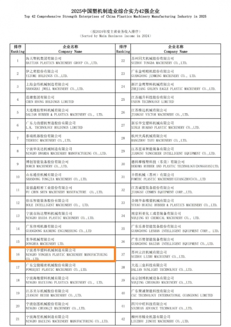 近日,中國塑料機械工業協會正式發布“2025中國塑料機械行業優勢企業”評選結果,寧波甬華塑料機械制造有限公司憑借扎實的綜合實力與持續創新的技術能力,成功入選“中國塑機制造綜合實力48強企業”第16名!這一榮譽不僅是對甬華塑機多年來深耕行業的肯定,更是對企業未來發展潛力的高度認可。