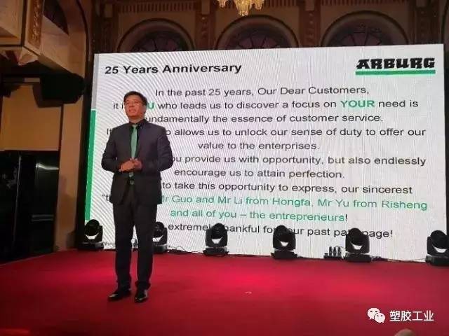 7月7日晚上6點半,阿博格中國25年周年慶典在上海著名酒店和平飯店隆重舉行。阿博格全球銷售總經理Boehm、阿博格第三代管理者Keinath女士、阿博格中國總經理佟朝、阿博格上海服務部經理張紹良和廣大媒體出席了慶典活動,《塑膠工業》雜志作為主要媒體也全程參加了此次周年慶活動。