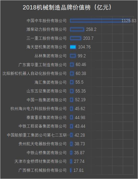 5月,2018中國品牌價值評價信息發布,海天塑機集團以品牌強度875,品牌價值104.76億元位列機械制造榜第四名,在所有參加評選的塑料機械企業中位居第一,這也是海天連續第五次入圍中國品牌價值排行榜機械制造領域十強,充分展現了其在產品質量、技術創新、銷售服務等方面所具備的強勁潛力和綜合市場競爭力。